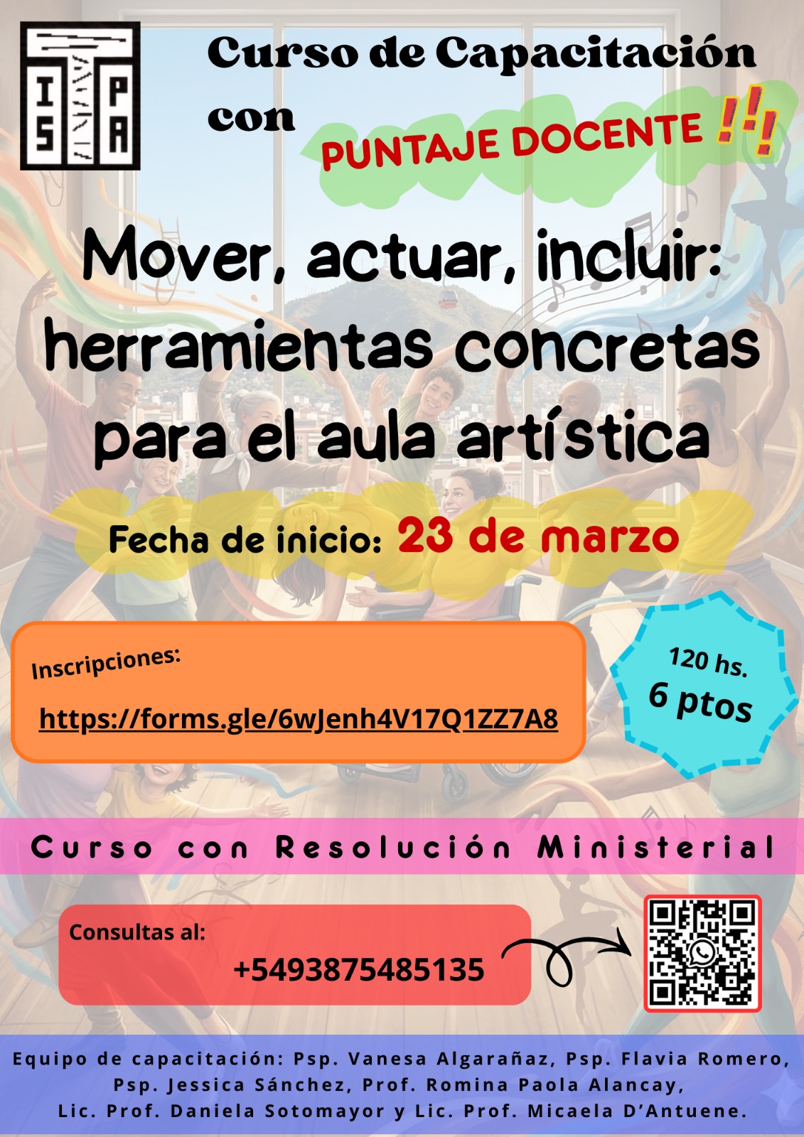 Buenos días a toda la comunidad educativa del ISPA Nº 6004 y comunidad docente en general me comunico con ustedes con el objeto de invitarlos a una actividad de capacitación. Nuestro Instituto Superior de Profesorado de Arte N°6004 abre las inscripciones al curso de capacitación «Mover, actuar, incluir: herramientas concretas para el aula artística»